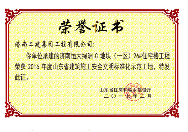 我集團公司承建的恒大綠洲C地塊(一區)26#住宅樓工程榮獲2016年山東省建筑施工安全文明標準化示范工地。