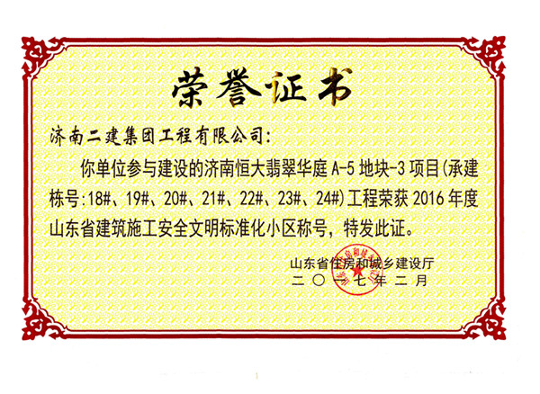 我集團(tuán)建設(shè)的恒大翡翠華庭A-5地塊-3項(xiàng)目工程榮獲2016年度山東省建筑施工安全文明標(biāo)準(zhǔn)化小區(qū)稱號(hào)。